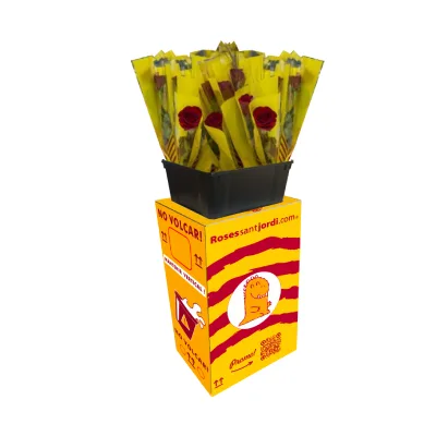 El packaging propi de Roses Sant Jordi - Mayoristas de rosas serveix també com a expositor directe, pensat perquè tot sigui ràpid, net i pràctic. Ideal per a escoles, associacions o col·lectius que no volen perdre temps en muntatges manuals.