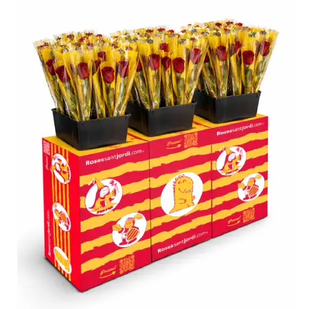 Todo incluido. Durante el día de Sant Jordi las podéis ir montando en el mismo punto de venta. Recibirás: las rosas, las bolsas, la cinta de Sant Jordi, las espigas, las cubetas y la caja-expositor.