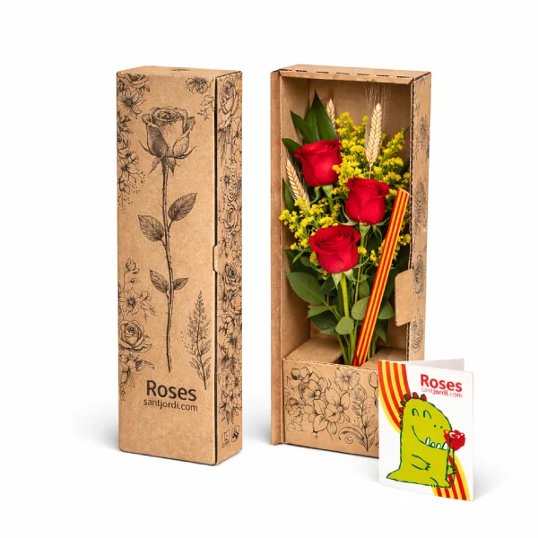 Imagina la sensació de rebre 3 roses de Sant Jordi a casa o a la feina el dia més especial de l’any. Si vols enviar roses de Sant Jordi a domicili, aquest ram és una de les opcions més completes per regalar per Sant Jordi.