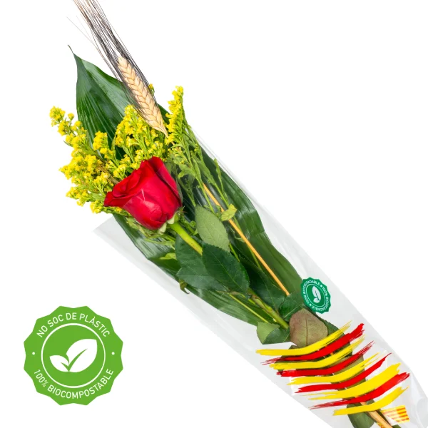 La combinació de rosa vermella, flor groga i fulla verda fa d’aquesta composició una de les més emblemàtiques per regalar el dia de Sant Jordi.